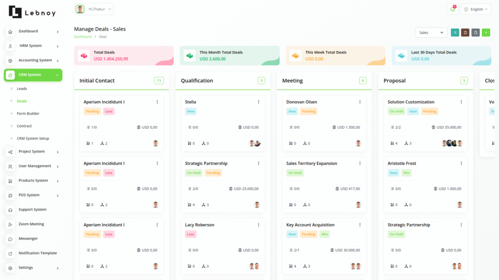 - Manage every deal with detailed cards showing its stage, value, status, and contacts.